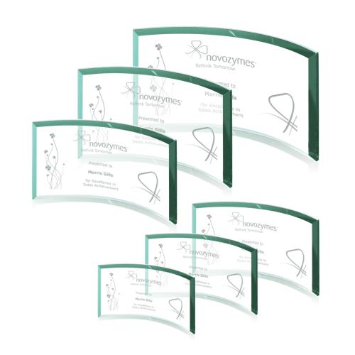 Enhance the significance of your recognition moments with our Crescent Jade Glass Trophy, a sophisticated award exuding elegance and a contemporary charm. Crafted from premium 0.375" thick jade glass, this freestanding curved and beveled rectangle trophy stands out with a subtle green tint, giving it a touch of warmth and depth. The trophy's crescent design lends a modern silhouette that is perfect for displaying on any mantel, shelf, or desk. Available in a versatile range of sizes including 3.5" x 6", 4" x 8", 5" x 9", and 6" x 11", to suit varying levels of achievement and recognition. With its ample space for personalized engravings and messages, this glass trophy is the ideal canvas to honor excellence, mark milestones, or celebrate special events in a truly memorable way.