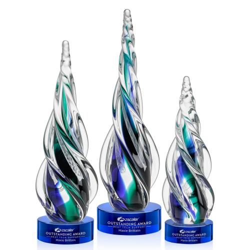 Honor remarkable achievements with the Alderon on Lockwood Base - Blue, an award that celebrates exceptional creativity and imagination. This outstanding trophy captures attention with its entrancing swirls of clear glass, gracefully intertwining with vibrant blue and green hues, culminating in an elegant teardrop summit. The piece is anchored upon a robust Optical Crystal base available in clear, ebony, or a striking sapphire that enriches its appearance. Crafted from the finest glass and crystal, it embodies the fantastical spirit of a unicorn's horn, poised to reward individuals who dare to envision the extraordinary. The Alderon Award is an impeccable symbol of recognition for those whose work or achievements have let their imagination soar to impressive heights.
