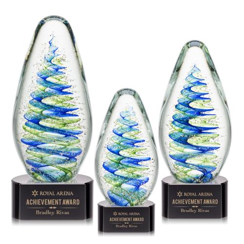 Celebrate excellence and make a lasting impression with our Jezebel Half Round Base Black Tear Drop Glass Trophy, a true piece of artistry. This exquisite award features a harmonious blend of blue and green swirls within a tear drop-shaped, hand-blown glass, capturing the essence of bespoke elegance. Each trophy stands as a one-of-a-kind accolade due to the individual hand-craftsmanship, meaning no two pieces are exactly alike. Resting on a sophisticated black half-round base offering space for customized engraving, this trophy is not just an award but a unique work of art, perfect for honoring remarkable achievements and personal milestones.