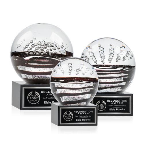 The Cummins on Plated Crystal Base Black Globe Glass Trophy is a masterpiece of art glass, meticulously hand-crafted by skilled artisans to ensure a unique piece every time. This award captures a sense of movement and depth with its flowing design and mesmerizing suspended bubbles, making it a stunning choice for recognizing excellence. Mounted on a sleek crystal base that's perfect for personalization, the globe-shaped Serenity Award combines elegance with a distinguished artistic expression. It's an ideal choice for honoring achievements with grace and sophistication. Crafted from high-quality glass, each piece is not only a testament to exceptional craftsmanship but also a symbol of unparalleled prestige.