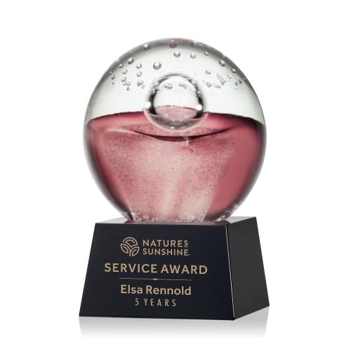 Capture the essence of achievement and worldly success with the Carrasco Small Crystal Base Black Globe Glass Trophy. This exquisite piece showcases a harmonious blend of artistry and elegance, featuring a ruby red art glass orb with an enchanting cosmic pattern of clear bubbles, symbolizing a global perspective and universal accolades. The trophy is poised atop a sleek, tapered black optical crystal base which offers a striking contrast and a rich backdrop for personalized engravings. Each Jupiter Award is a unique, handcrafted creation, ensuring that no two trophies are identical. This adds a bespoke touch to the already impressive display. Included in the purchase is one colorfill on the black base, allowing for distinguished customization to celebrate the recipient's special milestone or outstanding contribution. From global corporations to intimate ceremonies, this award is poised to make a statement of excellence that is both timeless and universal.
