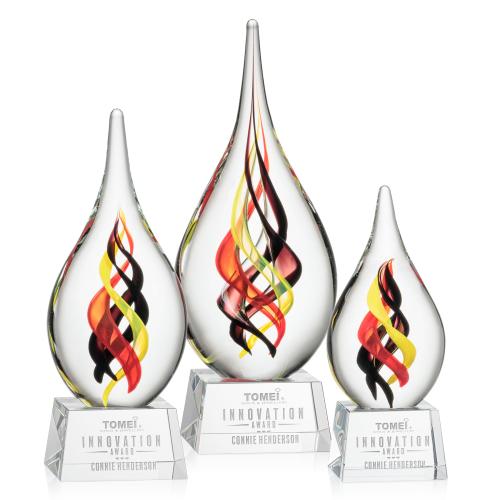 Elevate your recognition to an art form with the "McCauley" Award on Small Crystal Base. This exquisite hand-blown teardrop sculpture captivates the eye through its intricate triple helix pattern, weaving together deep burgundy, ruby red, and luminous yellow hues, signifying the fiery passion for excellence. Mounted gracefully on a small, pristine crystal base-available in clear to enhance the sculpture's brilliance-each unique piece promises to vary slightly, ensuring a one-of-a-kind accolade for your recipient. The hand-crafted nature of the "McCauley" Award underscores the individual achievement it celebrates, making it a prestigious addition to any display. Presented in a luxurious black satin-lined gift box, this trophy is not just a reward but a lasting emblem of distinction.