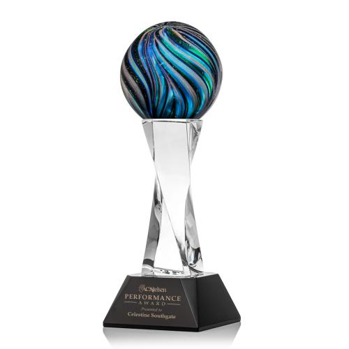 Elevate distinguished achievements with the mesmerizing McCray Globe Glass Trophy, a triumph of glass craftsmanship. This exquisite award is perched atop the sleek Spirale Spire Base, hand-crafted to showcase an entrancing globe with a symphony of iridescent gold, ebony, sapphire, and emerald swirls. Each trophy is a unique masterpiece, ensuring that no two awards are the same, reflecting the individuality of the recipient's accomplishments. Designed for customization, the black base offers ample space to engrave a logo or name, making it an unforgettable token of appreciation. The McCray Globe Glass Trophy is not just an award; it's a statement of excellence suitable for any prestigious occasion.