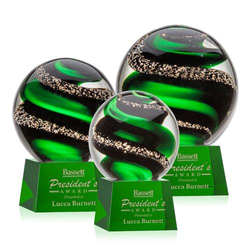 Celebrate exceptional achievements with the Boykin Green Globe Glass Trophy, an embodiment of artistry and recognition. Each trophy features a mesmerizing globe with spirals of emerald intertwined with black speckles, conjuring visions of Earth's natural elegance. Mounted on a choice of tapered Black, Green, or Clear Optical Crystal Base, these unique pieces are handcrafted, ensuring no two awards are the same. This stunning work of art includes one color fill to personalize the base, enhancing its bespoke character. Ideal for honoring outstanding contributions or celebrating significant milestones, this glass trophy will stand as a testament to excellence for years to come.