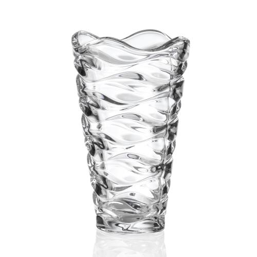 Embrace elegance and craftsmanship with our George 10.75" Glass Vase, a stunning piece that combines modern design with timeless beauty. Expertly cut with deep, intricate patterns, this vase features a unique wave top, lending a dramatic and contemporary flair to any setting. Ideal for engraving, the vase offers an etching space under the base for a personalized touch, allowing for a discreet and meaningful message that will be treasured for years to come. Whether used as a standalone piece or as an award to commemorate special achievements, this glasswork of art not only adds a touch of sophistication to any space but also serves as a tangible expression of appreciation. Optional pad printing on the gift box is available to enhance the gifting experience, making the George Vase a perfect choice for recognition or a special token of esteem.