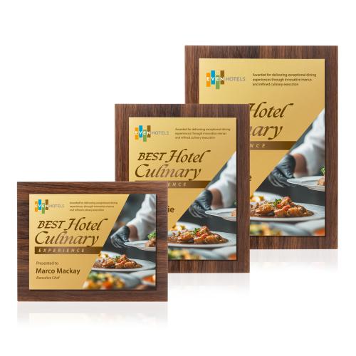 The Millsboro Full Color Plaque, with its elegant walnut finish and vibrant gold plate, is perfect for celebrating achievements and milestones with style and grace. Its rich wood grain evokes warmth, adding a timeless sophistication to any setting. The striking contrast between the walnut and gold creates a visually stunning piece that commands attention. Ideal for recognizing exceptional service or significant accomplishments, this plaque offers a lasting tribute that's both meaningful and professional. Personalize it to honor your recipients, making it a cherished keepsake for years to come.