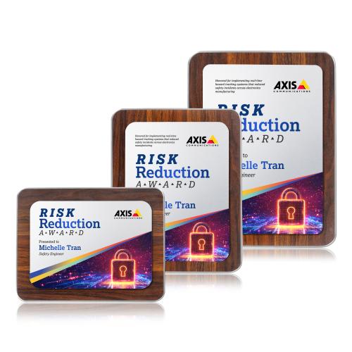 The Reston Full Color Plaque is a distinguished choice for recognizing excellence and achievements. Crafted with a rich walnut-finish frame, this plaque features a sleek silver metal plate, providing a luxurious backdrop for your personalized message. The clean lines and rounded corners offer a timeless design that effortlessly complements any office or awards ceremony setting. Ideal for corporate recognition, supplier awards, and celebrating milestone achievements, this plaque ensures your accolades are displayed with classic elegance. Each piece is made from quality wood, promising durability and a lasting impression. Personalize yours to make a memorable impact.