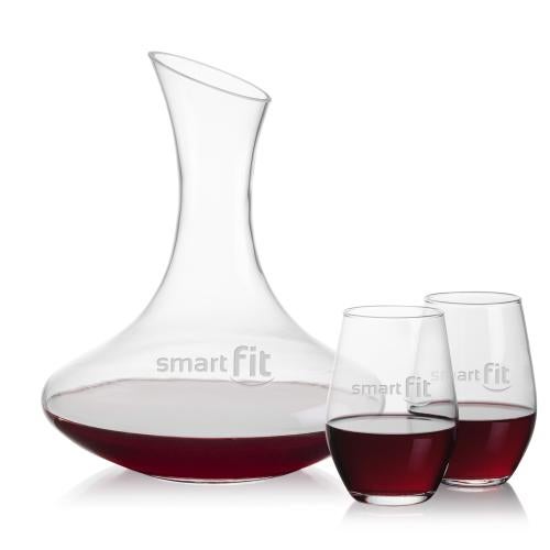 Elevate the art of wine presentation with the Compton Carafe & Presley Stemless Wine set, a symbol of sophistication and a testament to the connoisseur's taste. This premier collection, featuring a stunning 60oz Hampton Carafe complemented by a choice of two or four sleek stemless wine glasses, is crafted from the finest glass material, ensuring durability and elegance. The carafe's wide base and tapered neck are expertly designed to optimize aeration, unlocking the full potential of your wine, while the graceful stemless glasses invite a comfortable and contemporary drinking experience. Whether as an opulent gift or a centerpiece for your own gatherings, this set promises to enhance the bouquet and flavor of any chosen vintage. Please note that all items are presented unadorned, ready to be personalized for that extra touch of class.