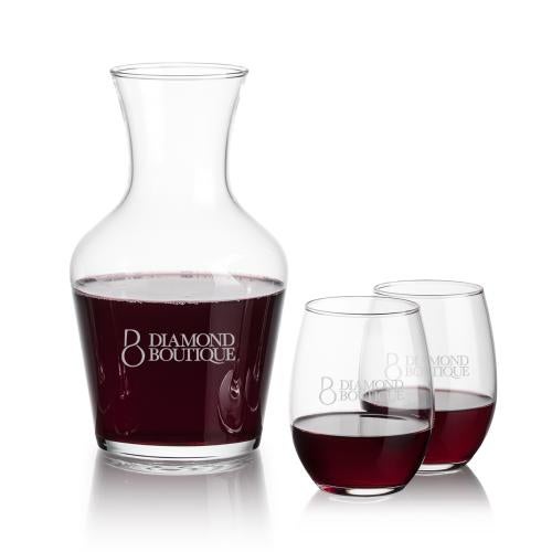Elevate your wine experience with the Summit Carafe & Street Stemless Wine set, a sophisticated ensemble designed to bring out the best in your favorite vintages. The carafe, boasting a generous 34-ounce capacity with a classic trattoria silhouette, presents a refined form for decanting and serves your wine with an extra touch of elegance. Completing the set, choose from either two or four Stanford Stemless 15-ounce wine glasses, each crafted to encourage the full-bodied characteristics of your wine to flourish while directing each sip smoothly to the front of your palate, accentuating the sweet notes. Crafted from premium glass, this set promises to be an essential centerpiece for intimate gatherings or a thoughtful gift for the discerning connoisseur. Please note, while the product image shows an option for personalized etching, all items are provided blank, ready for custom decoration to suit your specific occasion.